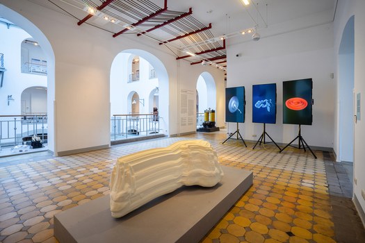 Beim Betreten des Görges-Baus ziehen zunächst die großformatigen Skulpturen der 1984 geborenen österreichischen Künstlerin Johanna Bruckner die Blicke auf sich, die ihrer rot-lila Farbigkeit, schwellenden Form und fleischig-anthropomorphen Oberflächenstruktur nach an menschliche Körperteile oder -flüssigkeiten erinnern. Doch ihre Über-Dimension und Un-Gestalt wendet die Assoziation zugleich ins Absurde oder Schambehaftete: »Body Obfuscations« eben, Körper-Verschleierungen, die mit alten Körperbildern ebenso aufräumen wie mit medizinischer Hybris.