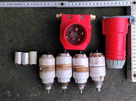 4 alte Sicherungsautomaten, KraftstromdoseVerkaufe diese 4 alten Porzellan-Sicherungsautomaten, gebraucht, die Prüfung der Funktionsfähigkeit wird in die Verantwortung des Käufers übertragen, dazu Dose und Stecker Kraftstrom und 3 kleine Stec ...