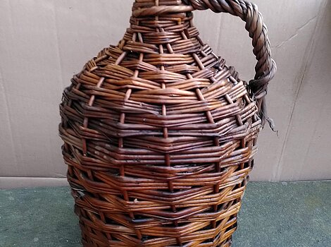 Korbflasche, Weinballon, 5 LiterVerkaufe alten gebrauchten Weinballon, Korbflasche, weiß, Höhe etwa 40cm, Durchmesser etwa 22cm an dickster Stelle, Öffnung etwa 3 cm (siehe Fotos), die Flasche ist ganz, 5 Liter, 19,-€ ...