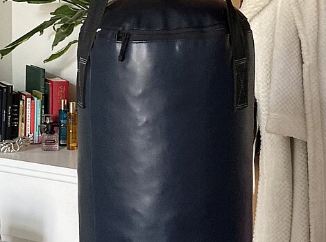 Boxsack outshock 2 von Decatlon20 kg, 107 cm hoch, dunkelblau, mit Aufhängung und Halterung incl. Holzschrauben (wenn gewünscht).