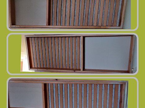Sogenannte 'Schubladenregale' hergestellt aus alten Schranksockeln. Der Hauptteil der Rückwand wurde mit Akustikpanel ausgekleidet.