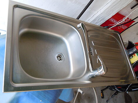 Nirosta Spültisch, Küche, Mischbatterie, Spüle, Garten, Haus, WGDiese ausgebaute Garten-Spüle mit Mischbatterie und Flex- Schläuchen mit Flex-Verlängerungen und Abfluss- Anschluss (siehe Fotos), gibt es für 20,-€.