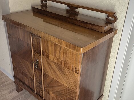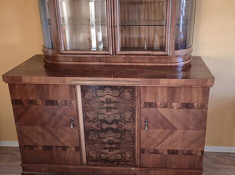 Auf der Kommode befindet sich ein schöner Aufsatz mit gläsernem Regalboden. Innen befindet si ...
