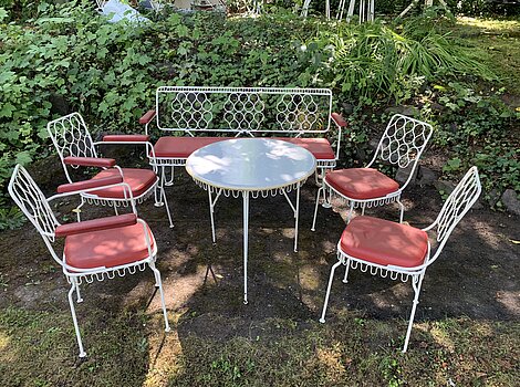 DDR Eisdiele Garten Möbel Garnitur Set 1960er Jahre Rarität Design-Ikone TOP-ZustandRARES DDR-RETRO GARTENMÖBEL-SITZGRUPPE VINTAGE: Komplett-Set, Sammlerstück, exklusives DDR-Original aus den 1960er-Jahren!