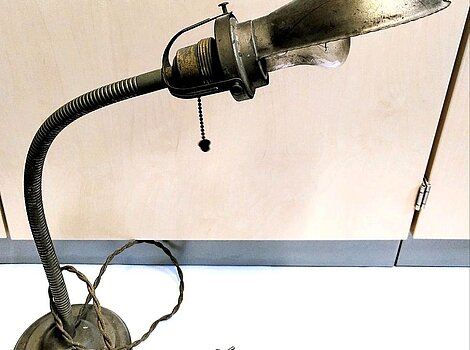 alte SchreibtischlampeVerkaufe alte, originale Schreibtischlampe, massiver eiserner Standfuß mit goldfarbenem Messing- (?) Blech ummantelt, flexibler Arm, drehbarer Schirm, Kette mit Schalter für An/Aus, mit alter Glühbirn ...