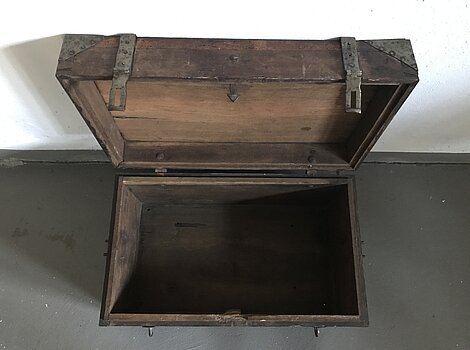 uralte massive Holztruhe Holzkiste Überseekiste Militärtransportkiste um 1900Verkaufe eine wunderschöne, massive alte Holzkiste mit robusten Eisenbeschlägen und historischer Patina. Sie wurde historisch zur Aufbewahrung von Gegenständen oder deren Transport genutzt (Holztruhe, ...
