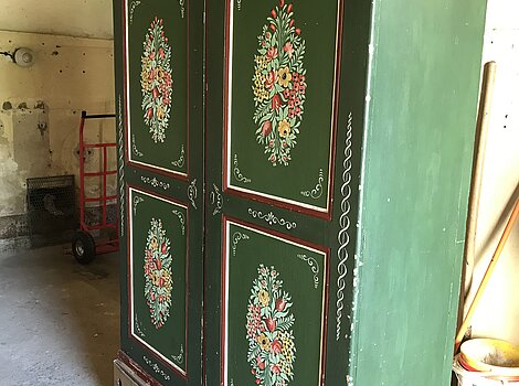 Antiker Bauernschrank Weichholz zweitürig handbemalt datiert 1977 UnikatDieser wunderschöne, geräumige Bauernschrank aus Weichholz ist ein absoluter Blickfang und ein spannendes Prachtstück für Liebhaber des Vintage-Stils. Er wurde 1977 handbemalt und besticht durch seine ...