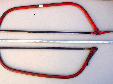 2 BügelsägenVerkaufe 2 alte, gut erhaltene und funktionsfähige Bügelsägen, Baumsägen "Extra Qualität" der Firma Muth, Made in Germany, schwarzer Stahlrohrbügel mit Markenzeichen, heller Holzgriff, verschraubte Sä ...
