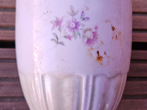 Porzellanbecher mit Brandspuren aus dem 2. Weltkrieg, JugendstilFür 18 Euro angeboten wird ein Keramikbecher mit Brandspuren aus der Nacht vom 13./14. Februar 1945, als Dresden im 2. Weltkrieg bombardiert wurde. Es handelt sich also um einen Sachzeugen des damalig ...