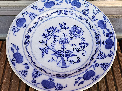 Keramikteller mit Zwiebelmuster-Dekor aus der Zeit um 1920Angeboten wird ein sehr gut erhaltener Zwiebelmusterteller aus Großmutters Küche für 12 Euro (VB). Außer einer gewissen Alterspatina weist er keine Abplatzer oder sonstige Benutzungsspuren auf. Das de ...