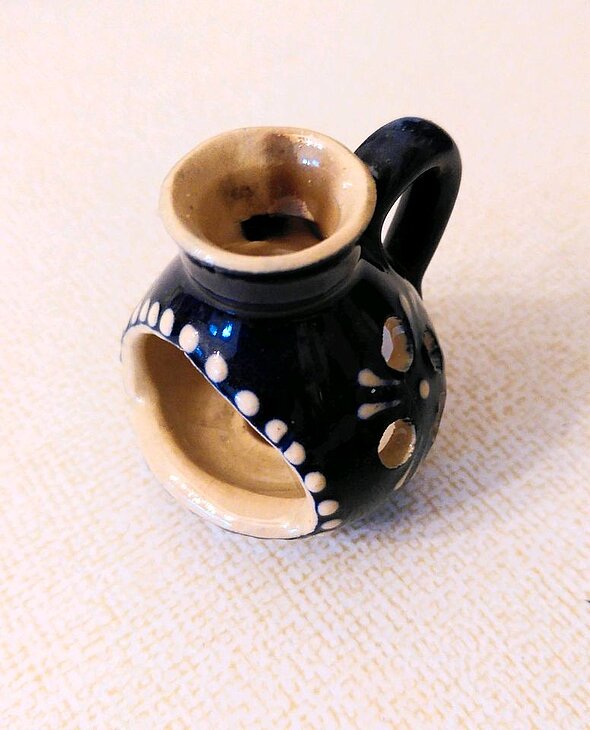 Verkaufe kleinen Keramikkrug für das Abbrennen von Räucherkerzen, mit kleinem Standring für die Kerzen, seitlichen Lichtöffnungen und großer Öffnung in der Front zum Bestücken, Höhe etwa 5cm, Durchmesser etwa 4cm, gebraucht, sehr gut erhalten, 12,-€