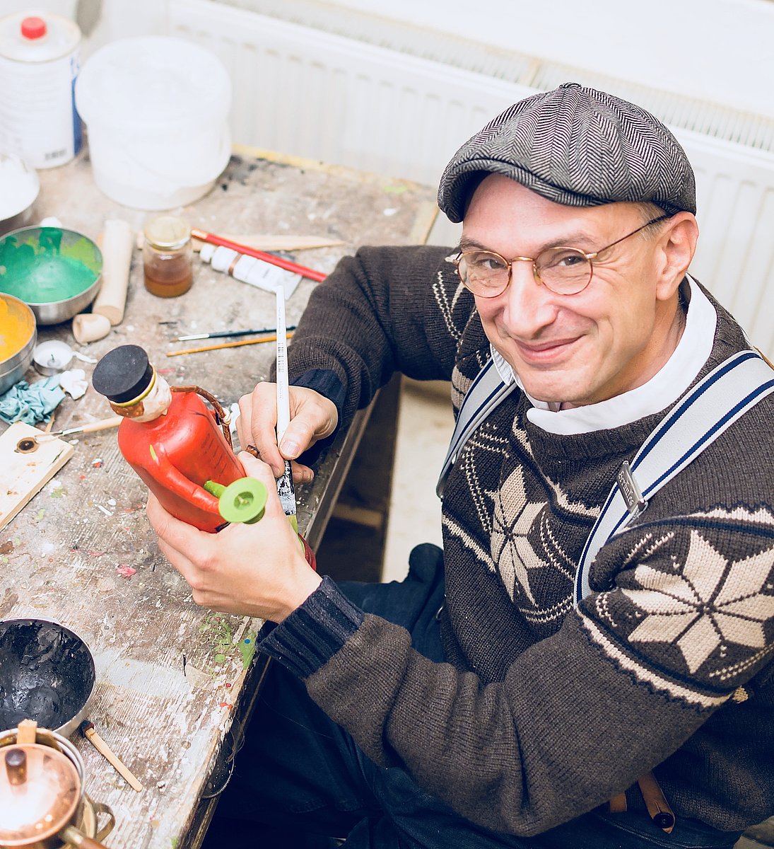 Mit diesem fing überhaupt alles an. Mehr noch mit der Unzufriedenheit Christian Schöbels ob seriell gefertigter Weihnachtsfiguren. Ihm, dem passionierten Liebhaber alter Fahrräder und charmanter 40er-Jahre-Gewandung, stand figürchentechnisch der Sinn nach dem Charme der Kaiserzeit. Der Preis für derlei handgefertigte Unikate (man wurde im Internet rasch fündig) dämpfte die Euphorie schlagartig. »Also habe ich mir bei einer Wanderung einen Ast gegriffen und in meiner Küche wie ein Honk daran rumschnitzt. Nach drei Tagen entwickelte sich langsam so etwas wie ein Turban.« Ein Turban? Richtig, die drittbekannteste Leuchterfigur des Ergebirges ist der sogenannte Lichtertürke. Warum der Osmane beim als konservativ geltenden Bergvolk einen derartigen Kultstatus genießt, lässt sich vielleicht damit erklären, dass es wohl kaum eine andere Region Deutschlands gibt, in der das Weihnachtsfest (und die damit verbundenen Rituale) eine derart gewichtige Rolle spielt. Eng mit dem Advent verbunden sind Aromen aus exotischen Gefilden sowie Räucherware und natürlich weitgereiste Gewürze, welche, zu Gebäck verarbeitet, mit einem Schälchen vom heißen Türkentrank, der adventalen Verschnabulierung anheimfallen. Möglicherweise spiegelt sich im Motiv des Türken auch die Sehnsucht des Erzgebirglers nach Exotischem wider, seine Neugier, der Spaß beim Blick über den Tellerrad.