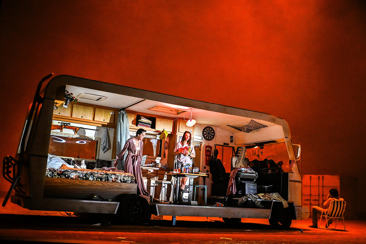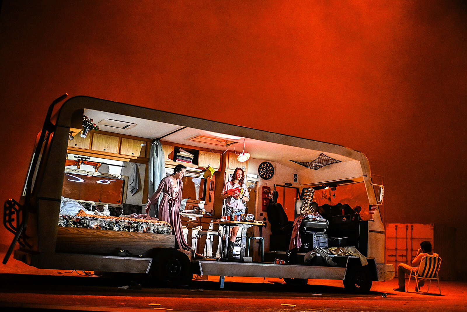 Der besondere Clou: Linnenbaum verlegt die Handlung, die ja laut Dramentext – der auch nicht geändert wurde – in einer kleinen Wohnung in New Orleans spielt, in einen Wohnwagen im Nirgendwo. Die von Bettina Meyer grandios gestaltete Bühne erinnert an Wim Wenders Film »Paris, Texas«, da ist die unendliche Weite, da beleuchten Straßenlaternen das Nichts, in dem eben jener Wohnwagen steht, davor eine schäbige Couch. Und natürlich ergibt das Sinn: Die armen US-Amerikaner der Gegenwart leben im Trailer. In der Realität stehen die in langen Reihen aufgereiht in riesigen Trailerparks; diese Enge, diese Form der Bedrängnis, will man hier nicht vermitteln, sondern stattdessen die trügerische Freiheit der offenen, weiten Ebene.