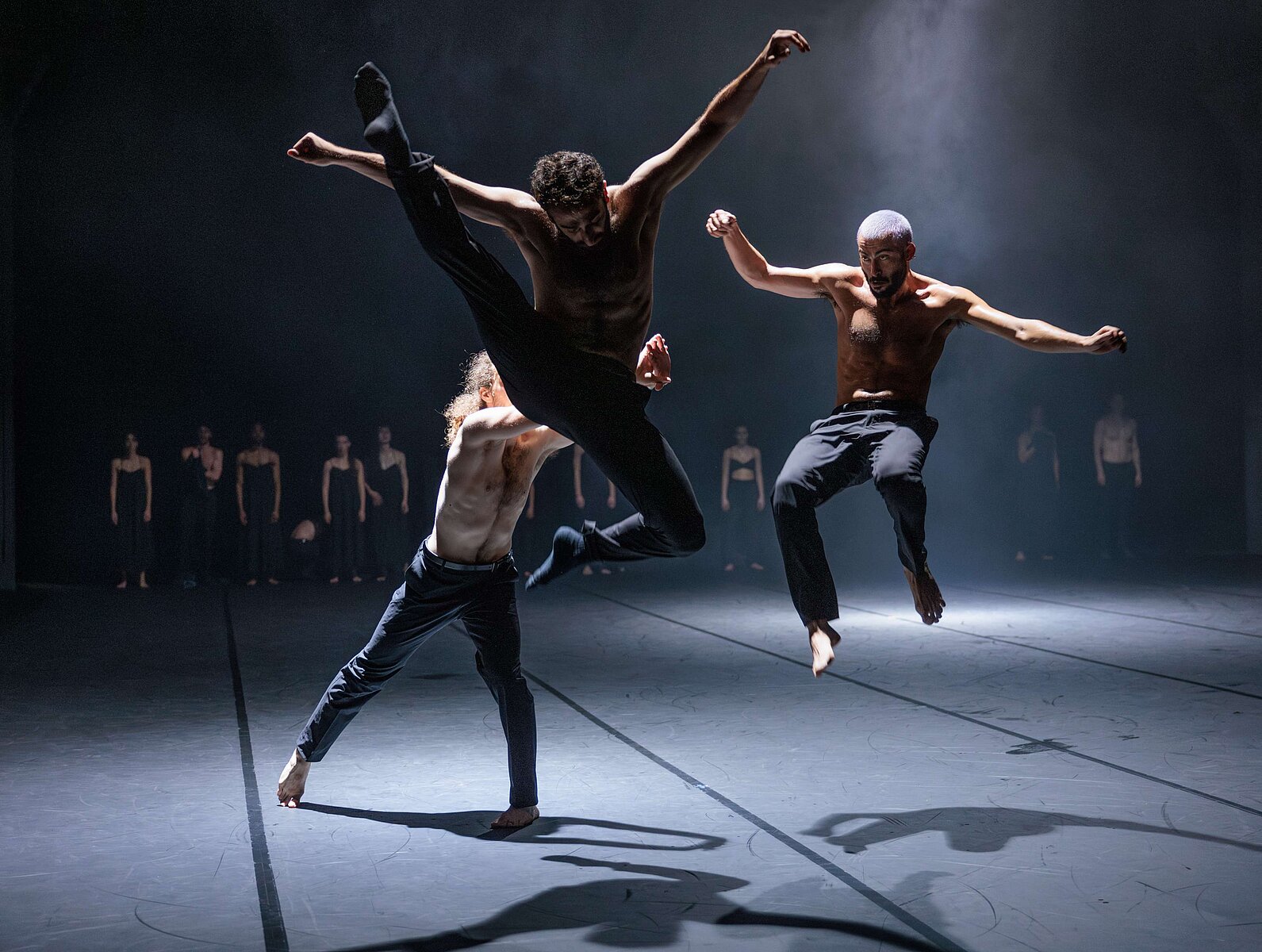 Festspielhaus Hellerau beginnt der dreiteilige Abend mit elf Tänzer:innen im schwarz ausgehängten Bühnenraum erstmal im erwartungsvollen Gleichgewicht. Ganz hinten aufgereiht die elf Tänzerinnen in Trainingsbekleidung, gegenüber das zahlreich erschienene Publikum. Auf der Bühne beginnen sich Gruppen zu formieren, schreiten durch den Raum, einzelne brechen aus, werden dynamischer. Mit Beginn des ersten Liedes „Der einsame Herbst“ werden die Bewegungen intensiver, eine Tänzerin rennt im großen Bogen über die Bühne, andere schlagen rhythmisch auf den Boden. Sprünge, Bodenrollen, Umkreisungen formen sich aus Wiederholungen heraus. Bewegungen werden voneinander abgenommen und verfestigen sich.