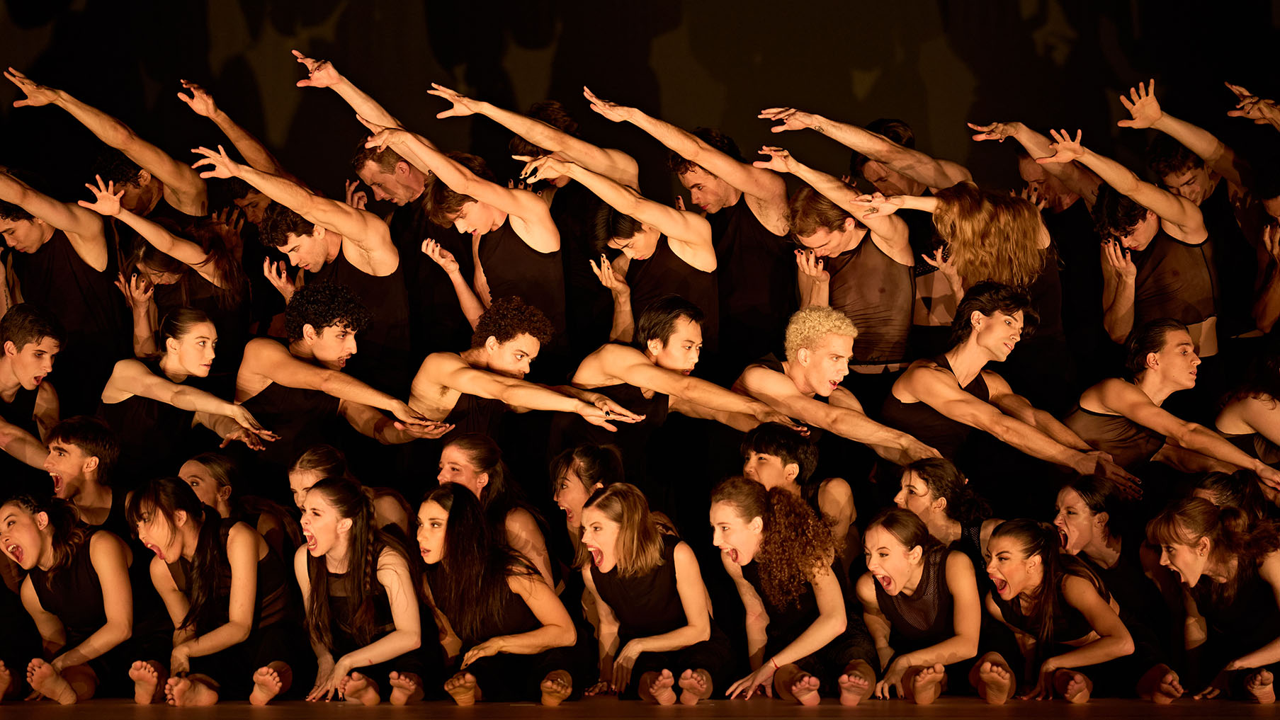 Der erste Teil COLOSSUS wurde 2018 von der australischen Choreographin Stephanie Lake am Arts Center in Melbourne mit Musik von Robin Fox herausgebracht. Aktuell ist sie für drei Jahre Artist in Residence beim Semperoperballett. In Dresden konnte sie für ihre szenische Recherche über das Verhältnis von Individuum und Gemeinschaft über 50 Tänzerinnen und Tänzer inszenieren. Mit dabei auch 16 Studierende der Palucca Hochschule für Tanz. Doch egal ob gestandene Solist:innen, Mitglieder des Corps de Ballet oder Studierende - in einem streng graphisch gehaltenen Bühnenbild aus schwarzgekleideten Körpern vor dunkler Rückwand finden sich alle in einer gleichgeschalteten, zuerst synchron am Boden und später in verschiedenen Sitz- oder Stehbildern organisierten Masse wieder. Dazwischen Gehen und Rennen nach Kommandos Einzelner. Nackte Arme und Beine schreiben zu einer Stimme aus dem Off eine streng durchkomponierte, gestische Partitur in den Raum, dazu kommen rhythmisches Atmen der Tanzenden, Körperpercussion, auch Schreie.